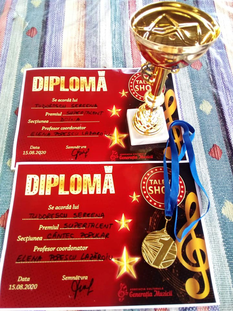 Sereena Tudorescu este cursantă a Școlii Populare de Artă Târgu Jiu, secția externă Bălești, disciplina canto muzică populară, anul II, coordonator Elena Popescu Lăzăroiu. Festivalul concurs online ,,Talent Show”, aflat la prima ediție, a fost organizat de Asociația Culturală Generația Muzicii, în parteneriat cu GAL Timișul de Centru.