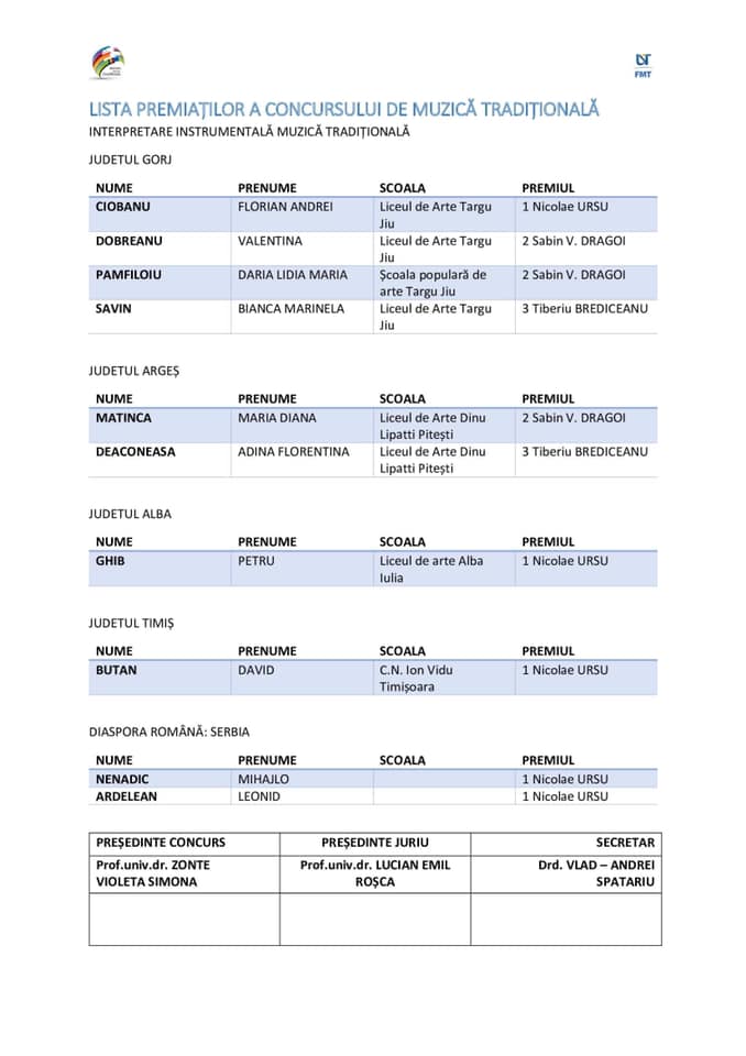 Mai mulți elevi din Gorj s-au numărat printre premianții primei ediții a Concursului Național de Muzică Tradițională, organizat de Universitatea de Vest din Timișoara, Facultatea de Muzică și Teatru: