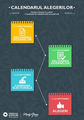 Luna aceasta, elevii trebuie să-și aleagă reprezentanții în consiliile de administrație ale unităților de învățământ. Potrivit calendarului anunțat de Consiliul Național al Elevilor, campania electorală se va desfășura în perioada 15 – 20 septembrie, iar alegerile în zilele de 21 și 22 septembrie.