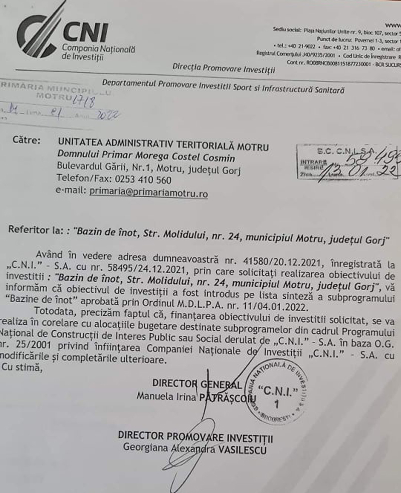 Autoritatea locală a primit ~verde~ de la CNI pentru finanțarea unui bazin de înot în municipiul Motru. Municipalitatea dorește că acesta investiție sa fie amplasată în incinta complexului sportiv Minerul Motru, mai exact pe fostul amplasament al vechilor ștranduri din anii ’80. În acest sens, în 2021, municipalitatea a făcut mai multe demersuri ca acest amplasament sa fie degrevat de orice sarcină, lucru care a făcut posibil ca în urma verificării documentației, CNI să aprobe oportunitatea și necesitatea realizării unui astfel de bazin de înot în municipiul Motru. Astfel, primăria din Motru a primit, recent, răspuns că solicitarea cu privire la noul bazin a fost cuprinsă pe lista sinteză, municipalitatea urmând să beneficieze de finanțarea solicitată. După primirea banilor, lucrarea va debuta, cu siguranță, în foarte scurt timp.