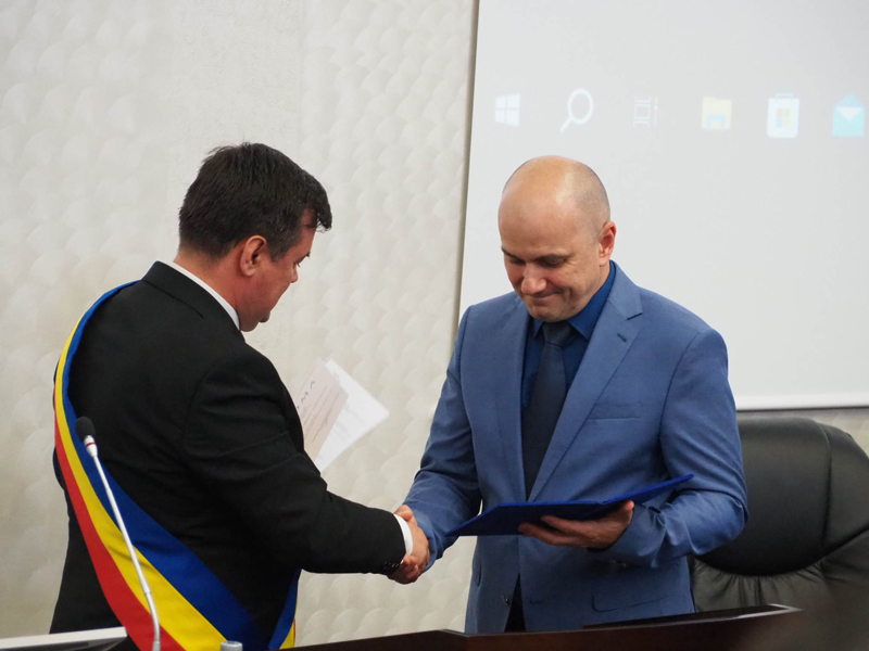 Marcel Romanescu, primarul municipiului Târgu-Jiu este cel care a oferit premiile simbolice pentru cei patru noi Cetățeni de Onoare ai municipiului în timp ce din prezidiu, consilierul Constantin Semen, din postura de președinte de ședință a condus lucrările ședinței festive de Consiliu Local Târgu-Jiu.
