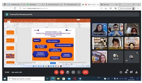Astfel, miercuri, 26 ianuarie 2022 a avut loc o nouă sesiune de informare și oportunități Erasmus+ ce vizează Acțiunea -cheie 1, proiecte de mobilitate de scurtă durată. Întalnirea a fost organizată  de Inspectoratele Școlare Județene Gorj, Arad, Bacău, Bistrița-Năsăud, Mehedinți, Satu-Mare, Tulcea și Vaslui în parteneriat cu Agenția Națională pentru Programe Comunitare in Domeniul Educației și Formării Profesionale. Scopul acestei activități a fost de a informa despre elementele de noutate privind accesarea proiectelor pentru anul 2022, aspecte tehnice și întrebări și răspunsuri cu Agenția Națională.