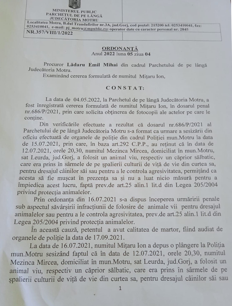 către câinii proprii, a unui căprior. Totul sub privirile acestuia. Procurorul nu numai că tratează fapta cu indiferență legat de cei indicat vinovat, ci încurcă borcanele la propriu, și îl face vinovat, în cuprinsul ordonanței, de fapta crudă pe Mircea Mezinca, cel care deține proprietatea unde a avut loc incidentul. Mai exact, pentru simplu motiv că acel căprior este devorat pe un teren deținut de Mezinca, în lipsa proprietarului din localitate și fără că acesta să dețină vreun câine, omul este indicat vinovat, din pix, atât de către procurorul Lădaru, cât și de polițistul de caz, Elena Mițoi de la Poliția Motru, cea care începe ancheta, apoi intră în concediu iar dosarul ajunge la alt coleg din Poliția Motru. În final, dosarul, prin declinare, ajunge la Poliția Animalelor din IPJ Gorj deși competentă în cauză era Poliția Motru.