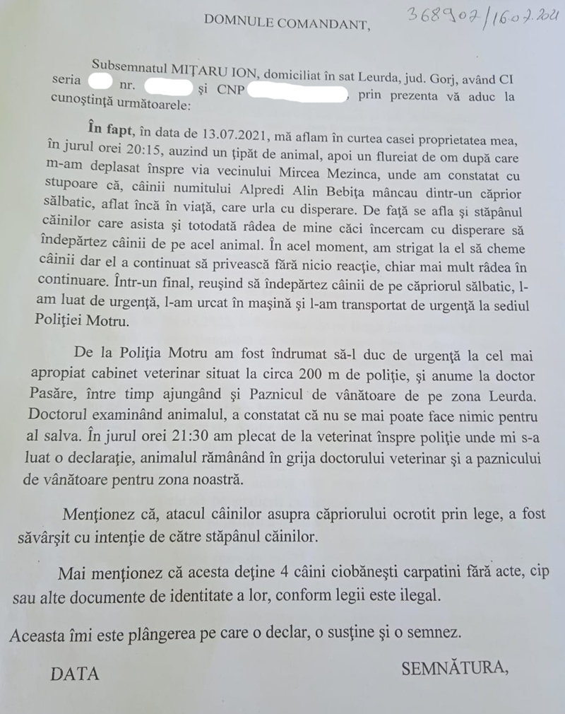 Reamintim că în iulie anul trecut, cei trei dulăi ai proprietarului Bebiță Alpredi, în prezența respectivului, au prins la Leurda un căprior de un an și jumătate, din care au mușcat cu sete. Deși proprietarul animalelor a văzut scena, nu a avut nicio reacție și nu a sărit în ajutorul căpriorului care țipa pentru a-și salva viața. Animalul a fost dus însă, de un vecin, la un veterinar din Motru, având pulpa din spate lipsă, după ce câini au mușcat bucăți de carne din acesta. Veterinarul nu a mai avut ce face pentru salvarea căpriorului și a fost apelat paznicul de vânătoare, care a cerut eutanasierea animalului, dar medicul a spus că legea nu îi permite. Căpriorul ridicat de paznic a murit câteva ore mai târziu.