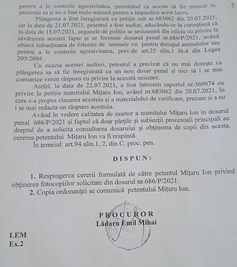 Pe data de 5 mai 2022, procurorul Mihai Lădaru de la Parchetul de pe lângă Judecătoria Motru dă o ordonanță de clasare a dosarului penal nr.686/P/2021 înregistrat la sesizarea lui Ion Mițaru, din Leurda, localitate componentă a municipiului Motru. Procurorul clasează cauza deși în cuprinsul plângerii, reclamantul indică o faptă penală cu autor cunoscut, în speță, Alin Bebiță Alpredi, din Leurda, care s-ar face vinovat de omorârea cu cruzime, de