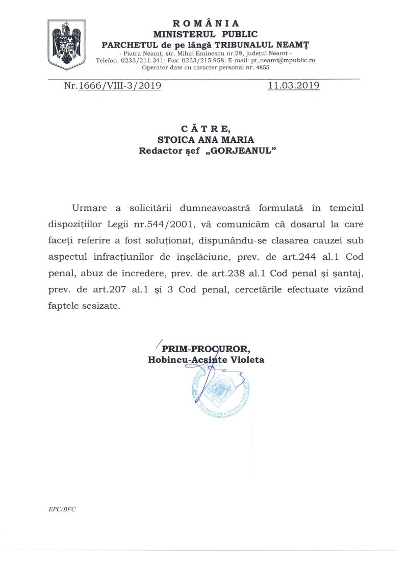 Din martie 2017 ancheta înaintează foarte greu, dovadă că pe 17 octombrie 2018 italianul face plângere la judecătorul de drepturi și libertăți atacând perioada lungă a cercetărilor, având câștig de cauză.Judecătorul obligă organul de cercetare penală, adică poliția din Roman, să finalizeze în maximum trei luni cercetările în acest dosar.Procuror-șef al Secției urmăriri penale, Liviu Nicolae Ionașcu, de la Parchetul de pe lângă Tribunalul Neamț, îl anunță pe italian, pe 24 decembrie 2019, că dosarul penal s-a clasat a doua oară, referatul poliției fiind cu propunere de clasare.Pe data de 5 februarie 2019, prim-procurorul PT Neamț respinge plângerea lui Lorenzo Fagnoni și confirmă clasarea dosarului penal. Același lucru îi este comunicat și Gorjeanul, în urmă cu câteva zile.