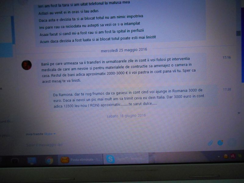 Lorenzo trimite, în ciuda acestor discuții, sute și mii de euro, chiar și în 2016, familiei Ștefănescu, Ramona ajungând să-i ceară bani inclusiv pentru spital, pentru o intervenție medicală.,,Din 26 mai 2016, până pe 17 iunie 2016, Ramona a primit de la mine peste 7140 de euro, plus 1300 de euro pe care i-am trimis mamei acesteia.Totul pentru că Ramona mi-a motivat că avea nevoie de o intervenție chirurgicală urgentă la un spital din Cluj, cu o parte din sumele respective urmând să-mi amenajeze dormitorul și baia din casa construită din banii mei.Ea mi-a spus telefonic că dacă nu face operația respectivă ea nu poate să mai aibă copii”, a specificat italianul, care o anunțase pe tânără că, la finalul lunii iunie urma să ajungă acasă, la Roman, și astfel să se căsătorească și să trăiască amândoi așa cum și-au dorit.