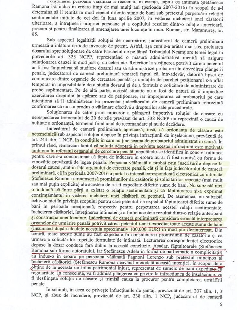 ,,Consider că, în ciuda faptului că prejudiciul în cazul meu este mai mic decât în dosarul Thiela vs.Mărăgăian, procurorii din Neamț trebuia să procedeze la fel ca și cei de la Gorj. Mai exact, Ramona Ștefănescu trebuia reținută și pusă apoi sub control judiciar, iar averea celor două, mamă și fiică, ar fi trebuit pusă și în acest caz sub sechestru. Mai mult, sunt două cazuri similare, în țară cu făptașele condamnate, pentru prejudicii similare cu ale mele. Sper ca magistrații din Roman să aplice legea, fără jumătăți de măsură, așa cum se întâmplă deja la Gorj și cum s-a întâmplat la Galați, cu românca ce a înșelat un belgian, și cu cea care a înșelat un francez. Am încredere în justiția română și sper să îmi recuperez paguba la finalul procesului.Țin să menționez că am deschis și un proces civil împotriva celor două femei la Tribunalul Piatra Neamț, și am avut deja primul termen pe 26 februarie 2019”, a conchis Lorenzo Fagnoni.În ceea ce privește punctul de vedere al Ramonei Ștefănescu, solicitat de Gorjeanul acesteia prin avocat, femeia din Roman a refuzat să contacteze publicația, în timp ce apărătorul acesteia a menționat că, clienta sa nu vrea să declare nimic vizavi de acest subiect.Menționăm faptul că, acest caz, aflat încă în anchetă este similar, dar într-o mai mică proporție, cu cazul prezentat de Gorjeanul din toamna anului 2017, cel privind acuzațiile dintre Francesco Thiela și Simona Mărgăian.