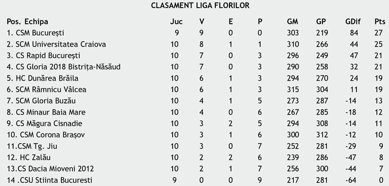 Handbalistele gorjence au fost învinse în runda cu numărul 10 a Ligii Florilor de către Minaur Baia Mare. Eșecul din Sala ,,Lascăr Pană” a venit după un joc extrem de echilibrat, decis în ultimele minute. Gazdele s-au impus cu 27-25, după o partidă în care Katarina Pavlovic, fostul inter croat al CSM-ului, a marcat de 8 ori. De partea cealaltă, trupa din Târgu Jiu încă se chinuie să-și găsească formula ideală fără cea mai importantă jucătoare din sezonul trecut, Angela Pușcaș, nerefăcută după un început de campionat extrem de ghinionist pentru ea. Pe lângă Ira Zinatullina, o altă absență de lungă durată, nici Simone Bohme, extrema daneză, care s-a dovedit foarte eficientă în meciurile de până acum, nu a putut fi folosită în Maramureș. Cum un necaz nu vine niciodată singur, oaspeții s-au lovit și de problema arbitrajului. În opinia lui Liviu Andrieș, rezultatul a fost influențat de prestația oficialilor din Piatra Neamț. ,,E păcat de munca pe care au depus-o fetele mele în această seară. Le felicit pentru ceea ce au făcut. Este inadmisibil însă. Este primul joc al acestor arbitri după nu știu câți ani și ei vin să-și bată joc. Nu este OK. Muncim zilnic, ne dăm sufletul pe teren, iar ei vin și fac, într-o oră, harakiri un meci. Nu este normal. Felicit echipa gazdă, au luat cele trei puncte. Mai multe nu am de spus”, a declarat, la interviuri, antrenorul gorjean. Andreea Chiricuță și Alexandra Gavrilă au înscris de câte 7 ori pentru CSM. Antrenorul băimărencelor a recunoscut că prestația gazdelor nu a fost grozavă, dar a fost mai mult decât fericit cu cele trei puncte. ,,Am spus-o și înainte de meci, cel mai important lucru era să câștigăm, chiar dacă speram să învingem mai clar, dar până la urmă sunt importante punctele. Cu Râmnicu Vâlcea am jucat bine, dar punctele s-au dus la ele. Acum a fost altfel. Acest campionat este unul foarte echilibrat. Noi ne vom bate să scoatem tot ce se poate. Mulțumesc încă o dată publicului care a venit la meci și ne-a încurajat până la final. Am avut mare nevoie de sprijinul lor”, a declarat Andrei Popescu. Clasamentul arată amenințător pentru gorjence după meciurile din această rundă. Mioveni a bătut-o acasă pe Vâlcea, iar Zalăul a remizat la Brașov.