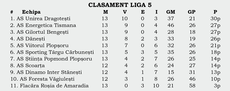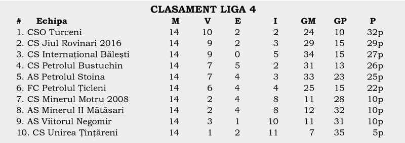 Runda cu numărul 14 din Liga 4 a fost pe placul formației CSO Turceni. Trupa lui Viorel Cojocaru s-a impus la Mătăsari și a profitat de egalul smuls de Bustuchin în ultimele minute ale jocului cu Jiul, pe care l-a găzduit. Tot o diferență de 3 puncte între primele clasate se înregistrează și în Liga 5, unde Unirea Dragotești conduce plutonul.