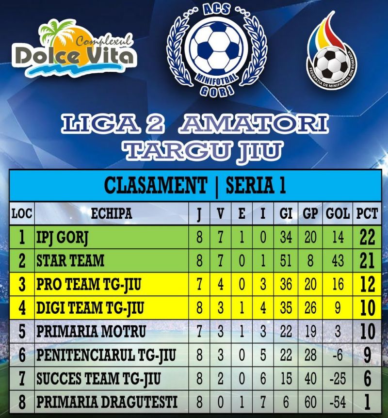 În Liga 2 Amatori s-au jucat meciurile din etapa 10 a sezonului regulat. Seria 1 continuă să fie dominată de echipele IPJ Gorj, campioana de anul trecut și Star Team, în timp ce în Seria 2 continuă duelul pentru primele două locuri, care duc direct în Play-off, între Green Team, Primăria Runcu și ACS Victoria 2 Târgu Jiu, toate câștigătoare în runda din weekend.