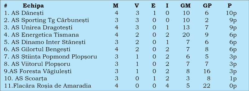 CS Jiul Rovinari este lider solitar în liga a patra. Neînvinși în primele runde, rovinărenii s-au impus, duminică, pe terenul formației din Bălești. Două partide din această etapă s-au încheiat fără goluri. Este vorba despre meciurile de la Bustuchin și Țînțăreni. Trei echipe nu au pierdut niciun meci la județ. În schimb, la ,,Onoare”, două formații vor fi penalizate cu meci pierdut. Este vorba despre echipele din Plopșoru, AS Știința și AS Viitorul. Jocul direct a fost întrerupt de o încăierare generală și nu a mai fost reluat. Tot în liga a cincea, un meci s-a terminat cu un scor-fluviu. La Tismana au fost marcate 11 goluri. Lider este AS Dănești, dar cu un meci în plus față de următoarea clasată, AS Sporting Târgu Cărbunești, care a fost nevoită să stea în această rundă.