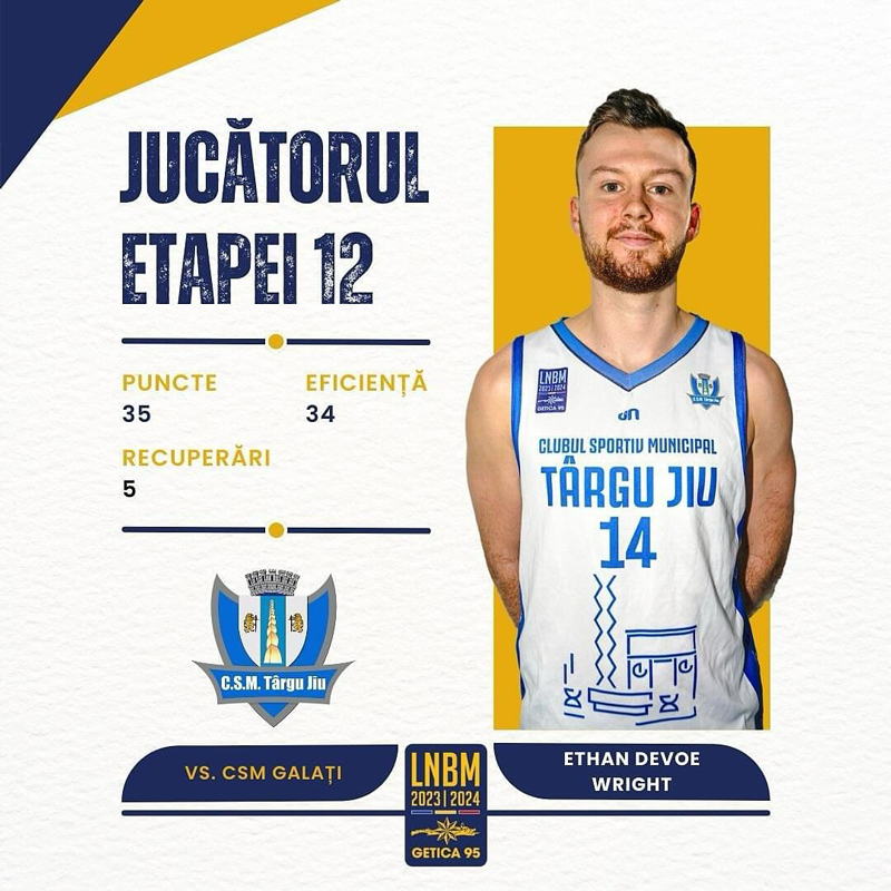 Încă un baschetbalist gorjean a fost evidențiat de Federația Română de Baschet. După ce Dimitrius Underwood a câștigat distincția ,,jucătorul etapei” acum două runde, când CSM Târgu Jiu a trecut de Dinamo București, a venit acum rândul conaționalului său, Ethan Wright, să ,,plece” cu titlul de MVP după prestația de la Galați. Formația lui Kresimir Basic a reușit o revenire de senzație în Sala “Dunărea” și s-a impus cu 89-73 în fața echipei conduse de Florin Nini. Wright a jucat aproape 36 de minute, timp în care a adunat 35 de puncte, 5 recuperări, o pasă decisivă și 3 intercepții. Baschetbalistul american a avut 6/9 din interiorul semicercului (67%), 6/9 de la distanță (67%) și 5/5 de la linia de libere (100%), pentru un indice al eficienței de +34. Shooterul CSM-ului a fost remarcatul rundei a 12-a și a contribuit la succesul gorjenilor, care fuseseră conduși la 21 de puncte. A fost a patra victorie din campionat pentru alb-albaștri, care au disputat până acum nouă meciuri în actualul sezon din LNBM. Wright a fost desemnat cel mai bun jucător și de site-ul de specialitate baschet.ro: ,,MVP-ul acestei etape a reușit să stabilească un nou record stagional la puncte în Liga Națională de Baschet Masculin. Echipa sa a ajuns la două victorii consecutive, iar Wright a fost crucial în succesul cu 89-73 în fața lui CSM Galați. Americanul a adunat 35 de puncte și 5 recuperări pentru 34 de unități la eficiență”. Alături de el, redacția baschet.ro a evidențiat alți patru jucători pentru cel mai bun cinci al rundei. Este vorba despre Mladen Jeremic (CSM Târgu Mureș), Derryck Thornton (CSM Focșani), Rashard Odomes (CSO Voluntari) și Peter Olisemeka (CS Vâlcea). Etapa viitoare, pe 16 decembrie, CSM Târgu Jiu va juca pe teren propriu, cu ABC Laguna București.