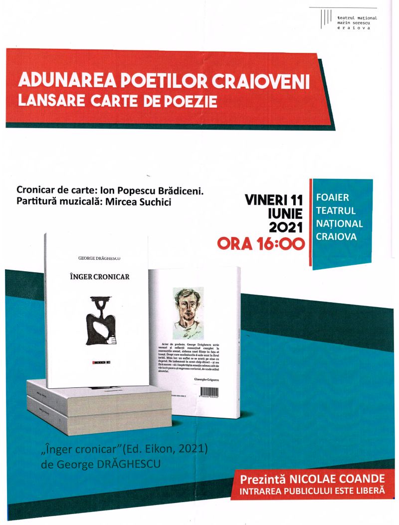 Sub semnul mirobolant al celor transcrise mai sus, printr-un dar şi dat al dicteului (suprarealist şi nu prea, căci din orice haos se naşte un nou univers: tematic, topofilic, motivic), m-am trezit, brusc, aşa cum îmi place mie (de-aici şi nesăţioasa-mi plăcere a textului neprogramat) invitat (de onoare – n.m., I.P.B.) să prezint un foarte important poet gorjean contemporan George Drăghescu – din postura deloc de invidiat, v-o jur, de cronicar de carte şi comentator la „Înger cronicar”, carte apărută în 2021 la „Eikon”. Evenimentul s-a produs la provocarea, onorantă, a unui scriitor de excepţie al Craiovei, Nicolae Coande, laureat al Atelierului Naţional de Poezie „Serile la Brădiceni” şi premiat de Academia Română, moderator al „Adunării Poeţilor Craioveni”, vineri, 11 iunie 2021, ora 16, în foaierul Teatrului Naţional „Marin Sorescu” Craiova. Întâmplarea literară şi artistică a beneficiat de partitura muzicală a maestrului compozitor şi interpret Mircea Suchici (la violoncel) şi el tot gorjean la obârşie. Sub bagheta magică a lui Nicolae Coande, publicul, nu prea numeros dar ales, a beneficiat şi de aportul celor doi actori ai Naţionalului Craiovean care au recitat din „Înger cronicar” cu o deosebită expresivitate. Şi Diana Drăghici şi Nicolae Vicol au rostit distinct şi cu o retorică plină de sens descoperit, în subcuantica textelor, de o reductibilitate autocenzurată confesiv, cu inteligenţă.
