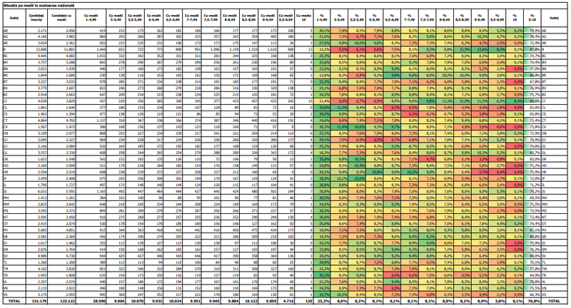 Potrivit datelor publicate de Ministerul Educației, la nivelul județului nostru s-au înregistrat 1558 de medii mai mari sau egale cu 5, după cum urmează: medii între 5-5,49 – 164, medii între 5,5-5,99 – 185, medii între 6-6,49 – 172, medii între 6,5-6,99 – 192, medii între 7-7,49 – 182, medii între 7,5-7,99 – 177, medii între 8-8,49 – 168, medii între 8,5-8,99 – 124, medii între 9-9,49 – 126 și medii între 9,5-9,99 – 68.