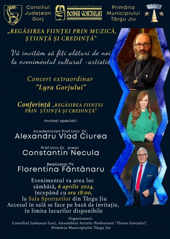Evenimentul, intitulat „Regăsirea ființei prin știință și credință”, va avea loc în data de 6 aprilie 2024, la Târgu Jiu, și este organizat de Primăria Municipiului Târgu Jiu și Consiliul Județean Gorj, alături de Ansamblul Profesionist „Doina Gorjului”.