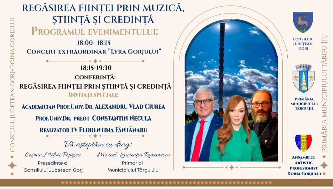 Evenimentul, intitulat „Regăsirea ființei prin știință și credință”, va avea loc în data de 6 aprilie 2024, la Târgu Jiu, și este organizat de Primăria Municipiului Târgu Jiu și Consiliul Județean Gorj, alături de Ansamblul Profesionist „Doina Gorjului”.