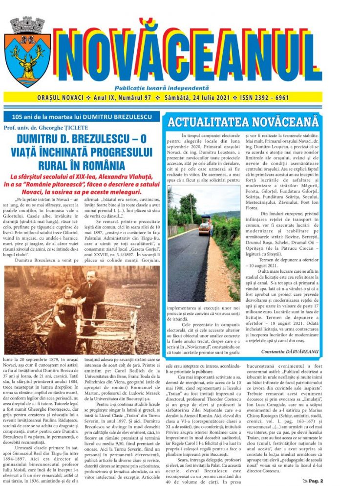 NOVĂCEANUL se deschide cu un extrem de documentat articol-studiu scris de Prof. univ. dr. Gheorghe Țiclete, ca un omagiu meritat la 105 ani de la moartea lui Dumitru Brezulescu. Chiar și titlul spune totul despre Dumitru D. Brezulescu – o viață închinată progresului rural din România. Se citează în șapoul însoțitor adnotări de La sfârșitul secolului al XIX-lea (când), Alexandru Vlahuță, în a sa „România pitorească”, făcea o descriere a satului Novaci, la sosirea sa pe aceste meleaguri. Ilustrat cu o fotografie de epocă, cu Dumitru D. Brezulescu în spatele unei băncuțe, probabil, din mesteacăn, stând în picioare în spatele băncuței și cu mâinile protectoare pe umerii unei frumoase și cochete doamne. Ne-ar fi greu să sintetizăm cele trei sferturi din prima pagină, așa că vom îndemna cititorul să caute NOVĂCEANUL tipărit ori să acceseze site-ul Primăriei orașului Novaci. ACTUALITATEA NOVĂCEANĂ, semnată și scrisă, fără patimă, de maestrul Constantin Dârvăreanu ne prezintă stadiul unor proiecte concrete ale Primarului urbei Novaci, dr. ing. Dumitru Leuștean. Suntem optimiști din fire și sper ca proiectele promise în campania electorală din luna septembrie a anului trecut, să nu rămână, ca la liberali, tot în stadiul de „vom face și vom drege”.