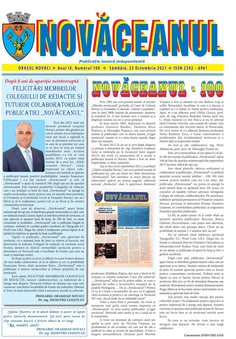 „Încă din 2012, când am devenit primarul orașului Novaci, printre alte gânduri pe care le aveam, era și înființarea unui ziar local, o oglindă în care să privească novăcenii și în care să se prezinte tot ceea ce se face în oraș pe timpul mandatului meu. Această posibilitate s-a ivit în vara anului 2013, cu puțin timp înainte de a avea loc „Zilele orașului Novaci”, când, împreună cu câțiva colaboratori, am hotărât să tipărim o publicație lunară, potrivit posibilităților noastre financiare. Publicației i s-a dat numele „NOVĂCEANUL” și iată că NOVĂCEANUL a ajuns la numărul 100, după opt ani de apariție neîntreruptă. Este meritul Colegiului de redacție care s-a străduit ca lună de lună NOVĂCEANUL să ajungă în casele novăcenilor, motiv pentru care, în numele meu personal, al Primăriei și Consiliului Local al Orașului Novaci, țin să-i felicit și să le mulțumesc pentru tot ce au făcut și fac pentru comunitatea novăceană”, scrie între altele bravul primar al urbei Novaci.
