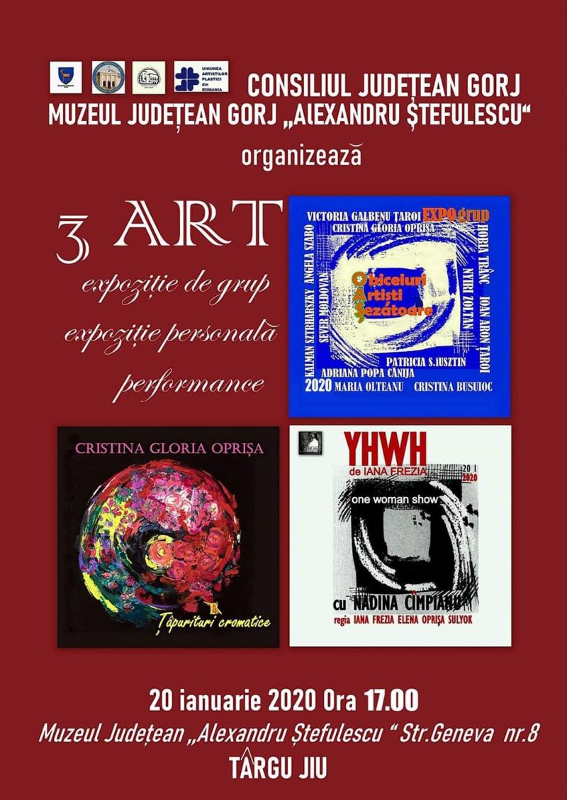 În această după amiază, de la ora 17.00, la Muzeul Județean Gorj ,,Alexandru Ștefulescu” din Târgu-Jiu va avea loc un triplu eveniment artistic. Este vorba despre expoziția de grup ,,OAȘ – Obiceiuri. Artiști. Șezătoare” (în care expun artiștii Cristina Busuioc, Adriana Popa Canija, Patricia S. Iusztin, Sever Moldovan, Maria Olteanu, Cristina Gloria Oprișa, Angela Szabo, Kalman Szthrarszki, Horia Trânc, Victoria Galbenu Țaroi, Ioan Aron Țaroi și Nyiri Zoltan), expoziția personală ,,Țâpurituri cromatice ,,semnată de Cristina Gloria Oprișa și performance-ul (one woman show) ,,YHWH”, de Iana Frezia (regie și text), cu Nadina Cîmpianu. Evenimentul este organizat de Muzeul Județean Gorj ,,Alexandru Ștefulescu”, în colaborare cu Muzeul Județean Satu Mare și Asociația Teatrală ,,Genesis”. Expoziția colectivă ,,OAȘ” s-a născut în urma Taberei de creație ,,Orizonturi ” de la Vetiș, din vara anului 2018, și a vizitei în Țara Oașului. Expozița a fost itinerată în mai multe centre culturale. Cristina Gloria Oprișa trăiește și lucrează în Satu Mare, fiind un artist activ dar și un important curator și organizator de evenimente artistice. Iana Oprișa și Nadina Cîmpianu sunt absolvente ale Facultății de Teatru și Televiziune Cluj Napoca.