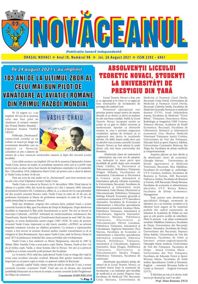 Numărul pe luna august, ultima de vară a capriciosului an 2021, este, în nota obișnuită, plin de articole interesante. Are, adică, de toate. Precum comemorarea a „103 ani de la ultimul zbor al celui mai bun pilot de vânătoare al aviației române din primul război mondial – Vasile Craiu”, semnat de Constantin Dârvăreanu, poeme ale scriitorilor novăceni, dar și o succintă prezentare a artistei plastice Daciana Ungureanu, profesoară de arte decorative în cadrul Școlii Populare de Arte Târgu Jiu, dar care, de vreo 20 de ani, învață copii să picteze folosind motive tradiționale, atât acasă, la Pociovaliștea, cât și în localul Casei de Cultură Novaci.