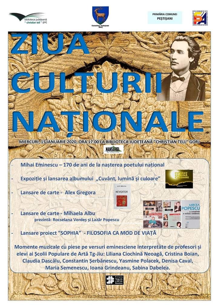 Școala Populară de Artă Târgu-Jiu, alături de Consiliul Județean Gorj, Biblioteca Județeană „Christian Tell” Gorj, Primăria Comunei Peștișani, organizează în această după-amiază, începând cu ora 17.00, o serie de activități dedicate Zilei Culturii Naționale și împlinirii a 170 de ani de la nașterea poetului Mihai Eminescu.Astfel, la Biblioteca Județeană „Christian Tell” vor fi organizate lansări de carte, expoziția și lansarea albumului „Cuvânt, lumină și culoare” și lansarea proiectului „Sophia”. De asemenea, profesorii și elevii Școlii Populare de Artă Târgu-Jiu vor susține momente muzicale cu piese pe versuri eminesciene. Își vor da concursul: Liliana Ciochină-Neoagă, Cristina Boian, Claudia Dascălu, Constantin Șerbănescu, Yasmine Polacek, Denisa Caval, Maria Semenescu, Ioana Grindeanu, Sabina Dabelea. Intrarea este liberă!