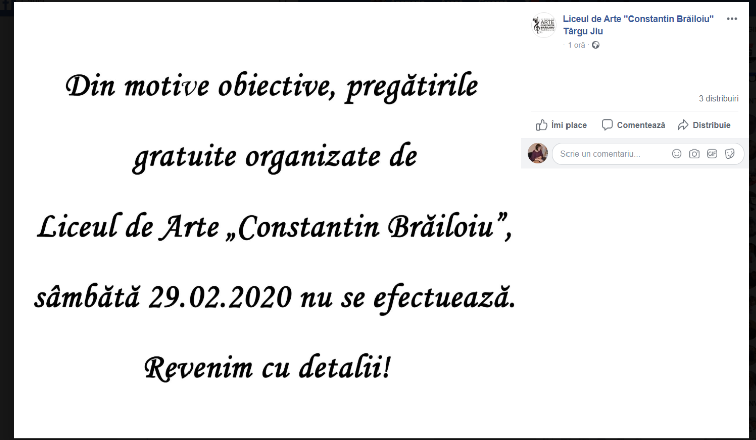 Directoarea Liceului de Arte din Târgu-Jiu, Daria Haidău, a organizat, miercuri seară, o întâlnire cu părinții elevilor, dar și cu școlarii care au fost invitați să participe la o olimpiadă școlară la Buzău, pentru a stabili dacă este cazul să se onoreze invitația sau nu. La baza schimbării planurilor stau recomandările Ministerului Educației legate de Coronavirus.
