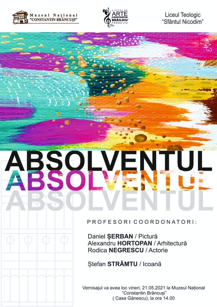 Expoziția „Absolventul” va fi vernisată, mâine, la ora 14.00, la Muzeul Național „Constantin Brâncuși”. Profesori coordonatori: Daniel Șerban – pictură, Alexandru Hortopan – arhitectură, Rodica Negrescu – actorie, Ștefan Strâmtu – icoană. Vor fi pe simeze lucrări ale absolvenților Liceului de Artă „Constantin Brăiloiu” și Liceului Teologic „Sfântul Nicodim”.