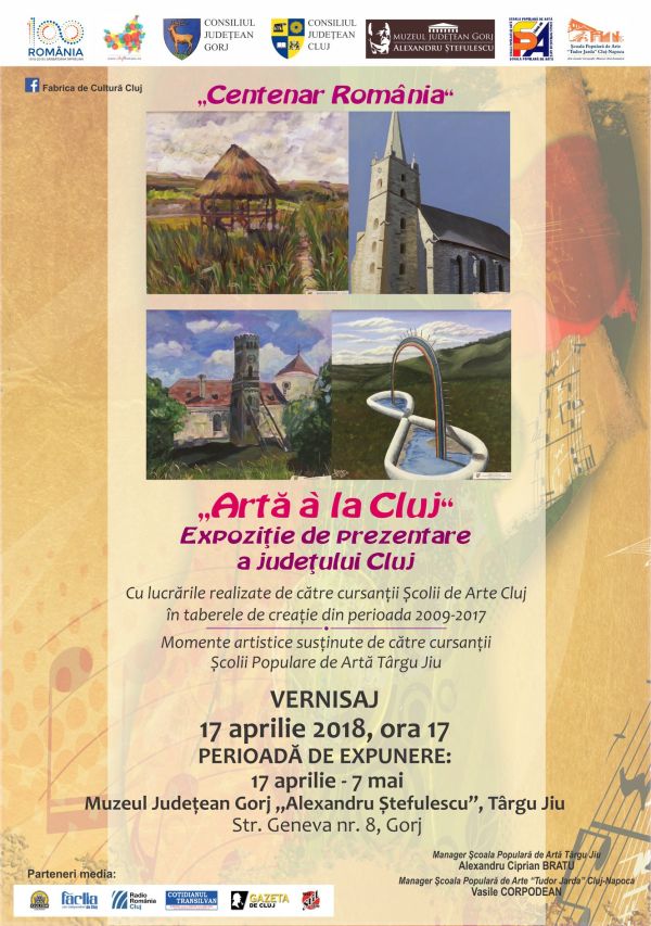 Şcoala Populară de Artă Târgu-Jiu şi Şcoala Populară de Arte “Tudor Jarda” din Cluj, alături de Consiliul Judeţean Gorj, Consiliul Judeţean Cluj şi Muzeul Judeţean “Alexandru Ştefulescu”, organizează marţi, 17 aprilie, ora 17.00, la Muzeul Judeţean “Alexandru Ştefulescu”, vernisajul “Artă à la Cluj”.