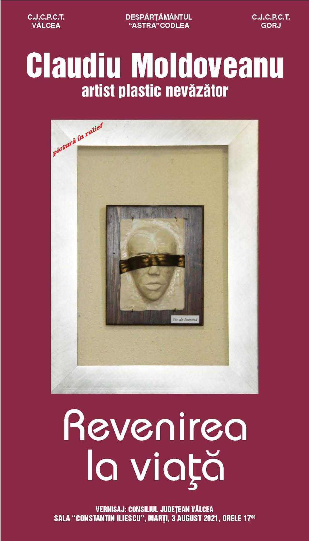Centrul Județean pentru Conservarea și Promovarea Culturii Tradiționale Gorj, Despărțământul ASTRA Codlea și CJCPCT Vâlcea organizează marți, 3 august, începând cu ora 17.00, la Consiliul Județean Vâlcea, la sala “Constantin Iliescu”, vernisajul expoziției “Revenirea la viață”, aparținând artistului nevăzător Claudiu Moldoveanu.