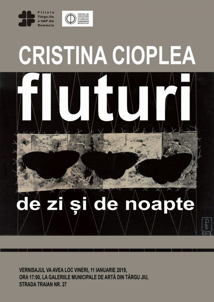 Filiala Târgu-Jiu a UAP din România, în parteneriat cu Centrul de Cercetare, Documentare și Promovare „Constantin Brâncuși” organizează vineri, 11 ianuarie 2019, ora 17.00, vernisajul expoziției de arte vizuale „Fluturi de zi și de noapte”, realizat de Cristina Cioplea, membru titular al Filialei Târgu-Jiu a UAP din România. Curator: Vasile Fuiorea, Florin Gheorghiu. Expoziția este deschisă publicului în perioada 11 ianuarie 2019–23 ianuarie 2019.