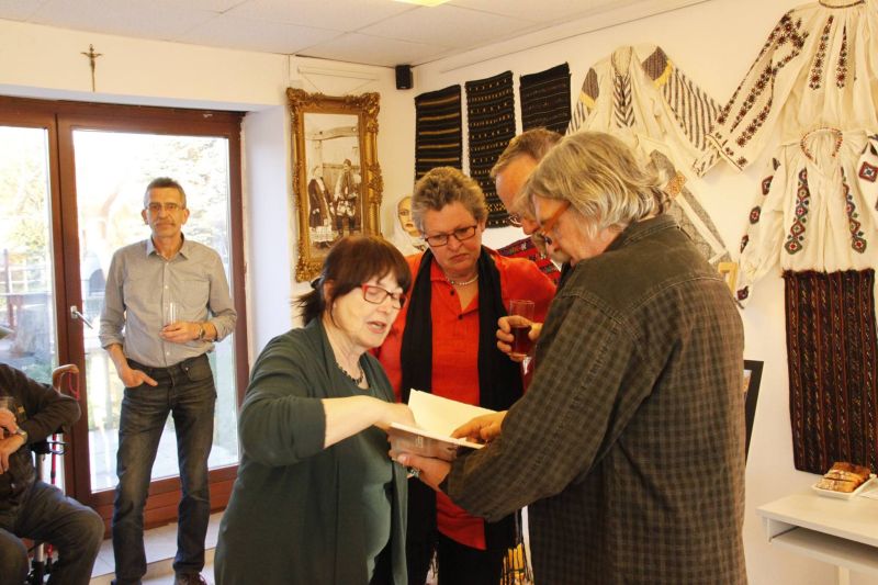 10421348_10206727265809971_3208909026038516231_nDacă la un vernisaj organizat la Târgu-Jiu dai cu tunul şi nu vezi urmă de primar sau de vreun parlamentar, decât dacă-i an electoral, ei bine, la evenimentul din Germania este altfel. Dintre personalităţile care au onorat cu prezenţa îi amintim pe reprezentanţii Departamentului pentru cultură ai judeţului Kronach, în frunte cu şefa Direcţiei, Gisela Lang, prezentă într-o fotografie în timp ce răsfoia Albumul „Călător prin Gorjul de odinioară”, autor Teodor Dădălău, domnia sa fiind o admiratoare a tradiţiilor populare româneşti şi o mare iubitoare a folclorului oltenesc.