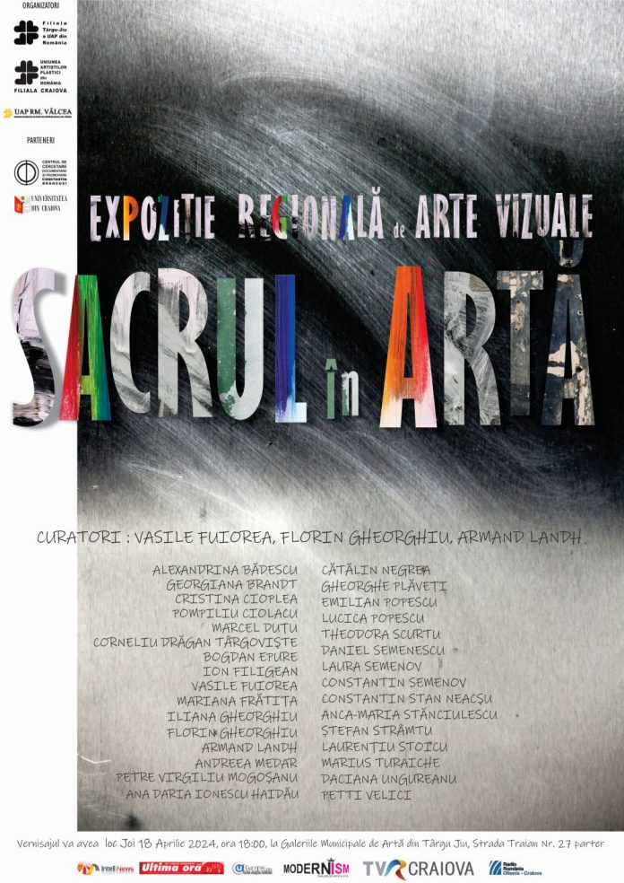 Filiala Târgu Jiu a Uniunii Artiștilor Plastici (UAP) din România, în colaborare cu Filialele Craiova și Râmnicu Vâlcea ale UAP din România, în parteneriat cu Centrul de Cercetare, Documentare și Promovare „Constantin Brâncuși” și Universitatea din Craiova, Facultatea de Teologie Ortodoxă – Domeniul Arte Vizuale, organizează joi, 18 aprilie 2024, de la ora 18:00, la Galeriile de Artă „Constantin Brâncuși” din Târgu Jiu, strada Traian, nr. 27, vernisajul Expoziției Regionale de Arte Vizuale ”Sacrul în artă”. Expoziția celor trei filiale ale Uniunii Artiștilor Plastici din România, este dedicată Sărbătorilor Pascale și cuprinde lucrări de artă laică și religioasă, fiind un eveniment artistic dedicat momentelor spirituale pe care urmează să le trăim.