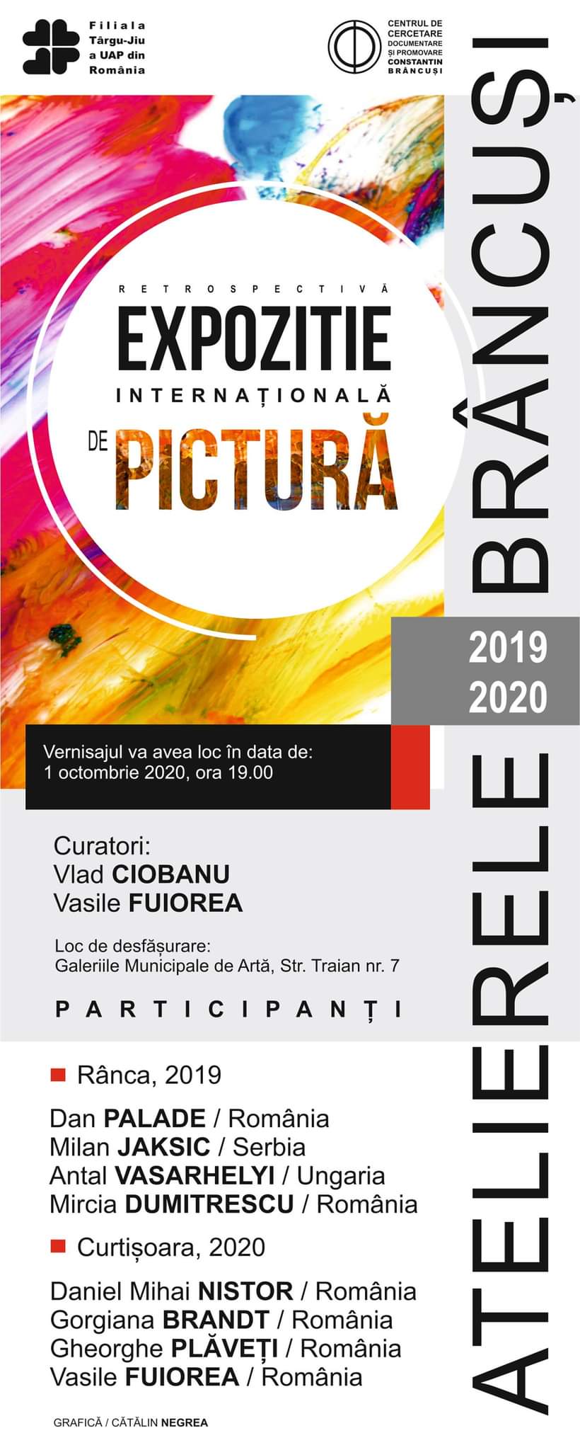 Centrul de Cercetare Documentare și Promovare „Constantin Brâncuși”, în parteneriat cu Filiala Târgu Jiu a UAP din România, organizează joi, 1 octombrie, ora 19.00, la Galeriile Municipale de Artă din Târgu-Jiu, Expoziția Retrospectiva de Pictură „Atelierele Brâncuși”, Ediția 2019, Rânca și Ediția 2020, Curtișoara. Curatori: Vlad Ciobanu, Vasile Fuiorea.
