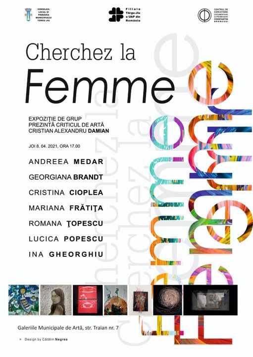 Filiala Târgu Jiu a UAP din România, în parteneriat cu Centrul de Cercetare Documentare și Promovare ”Constantin Brâncuşi” și Primăria Municipiului Târgu Jiu, organizează, în data de 8 aprilie, ora 17:00, la Galeriile Municipale de Artă din Târgu Jiu, vernisajul expoziției de Arte Vizuale ”Cherchez la femme”. ”Expun artistele: Andreea Medar, Georgiana Brandt, Romana Țopescu, Iliana Gheorghiu, Cristina Cioplea, Mariana Frătița, Lucica Popescu. Prezintă Criticul de artă Cristian Alexandru DAMIAN. Expoziția va fi deschisă în perioada 8-28 aprilie 2021 și va respecta normele de distanțare socială valabile pentru această perioadă”, au anunțat organizatorii.