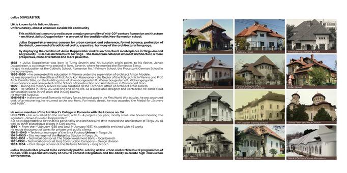 Proiectul este rezultatul colaborării dintre Uniunea Arhitecților din România (Sucursala Gorj) și Biblioteca Județeană „Christian Tell“ din Gorj şi prezintă creaţia arhitectului gorjean de origine austriacă. Vernisajul expoziţiei are loc în data de 17 octombrie, de la ora 18.00, cu participarea Olimpiei Bratu, manager al Bibliotecii Județene „Christian Tell“ şi a curatorului expoziţiei, arhitectul Mihai Iacob Maicovschi.„Arhitect de origine austriacă, Julius Doppelreiter (1878 – 1954) este autorul construcțiilor înscrise în patrimoniul național situate pe Calea Eroilor din Târgu-Jiu. Născut la Turnu Severin în 1878, fiul dulgherului austriac Johan Doppelreiter și al româncei Elena, s-a format profesional la Viena. Între 1893-1899 face practică în birourile de arhitectură ale profesorilor arhitecți Karl Hasenaner, rectorului Politehnicii din Viena, și Camillo Sitte, directorul Școlii Superioare de Construcții și Meserii din Viena, dar și pe șantiere de construcții ale Societății Union (clădiri publice și militare). Experiența practică a fost completată de studiile la Școala de Construcții și Arhitectură din Viena și Brno. (…) Din 1904 se stabilește la Târgu-Jiu, unde, până la moartea sa proiectează sau este antreprenor pentru mii de lucrări (după cum el însuși declară) comandate de clienți publici sau privați. Stilul construcțiilor sale se conturează mai ales după 1925. Astăzi se păstrează în Târgu-Jiu, dar și în alte locuri pitorești din Gorj, cel puțin 75 de imobile – case, sedii de primării, dispensare, cărora li se adaugă lucrări de artă, clădiri militare. Stilul neo-românesc al Caselor Doppelreiter, la care se folosesc materiale naturale (lemn, piatră, ceramică) le face ușor de identificat”, a declarat Olimpia Bratu, managerul Bibliotecii Județene „Christian Tell“.