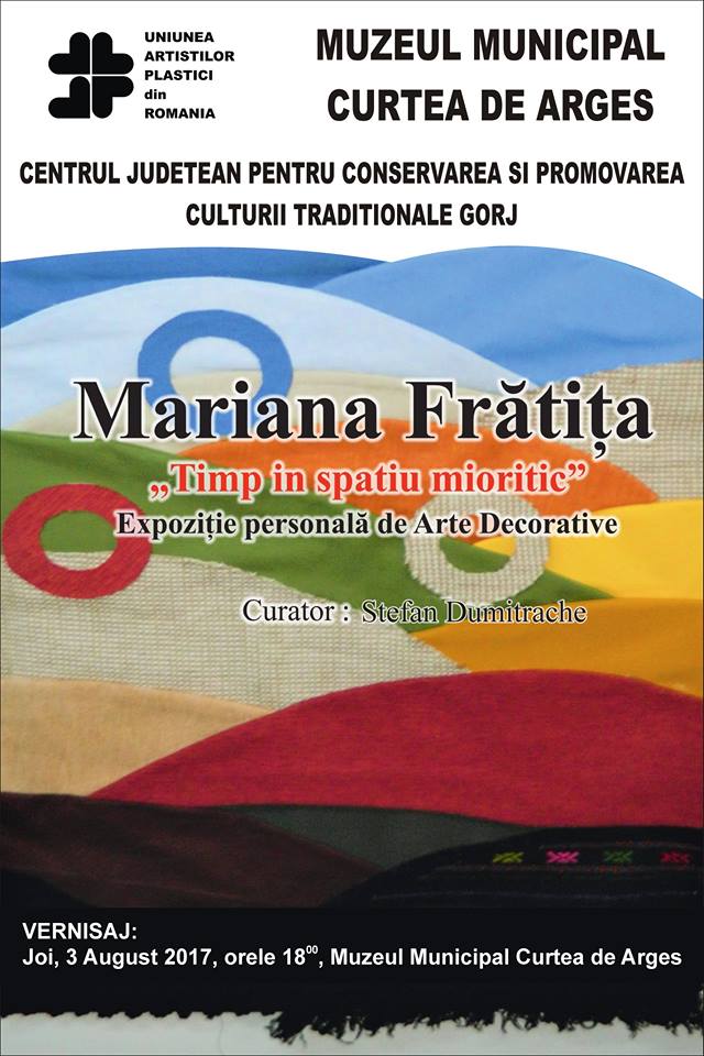 Centrul Judeţean pentru Conservarea şi Promovarea Culturii Tradiţionale (CJCPCT) Gorj organizează joi, 3 august 2017, de la ora 18.00, la Muzeul Municipal Curtea de Argeş, expoziţia „Timp în Spaţiu Mioritic” a pictoriţei Mariana Frătiţa.