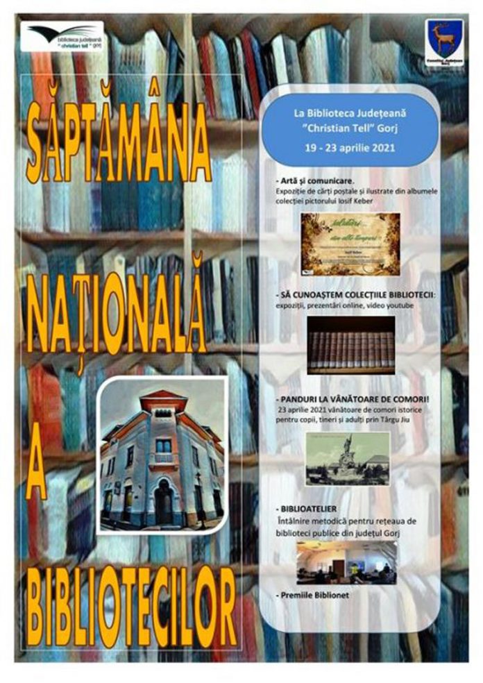 Săptămâna Națională a Bibliotecilor este sărbătorită la nivel național de bibliotecile publice din întreaga țară, în jurul datei de 23 aprilie, Ziua Internațională a Cărții și Drepturilor de Autor și Ziua Bibliotecarului Român. În această perioadă se organizează activități de promovare a lecturii, activități dedicate cărții și profesiei de bibliotecar. Biblioteca Județeană ,,Christian Tell” a pregătit mai multe evenimente pentru a marca această săptămână. Astfel, în perioada 19 – 23 aprilie, vor avea loc: o expoziție virtuală de cărți poștale și ilustrate din albumele colecției pictorului Iosif Keber, expoziții, prezentări online, video YouTube prin care toți cei interesați vor putea afla mai multe despre colecțiile bibliotecii, o vânătoare de comori istorice pentru copii, tineri și adulți prin Târgu-Jiu, programată în data de 23 aprilie 2021, dar și o întâlnire metodică pentru rețeaua de biblioteci publice din județul Gorj; tot în această perioadă vor fi acordate și Premiile Biblionet.