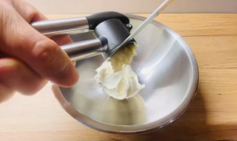 crema de brânză într-un castron, adăugați usturoiul, sare şi piper după gust, laptele, firele de arpagic şi amestecați totul bine, după care se pune la frigider timp de aproximativ 30 de minute.