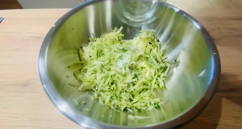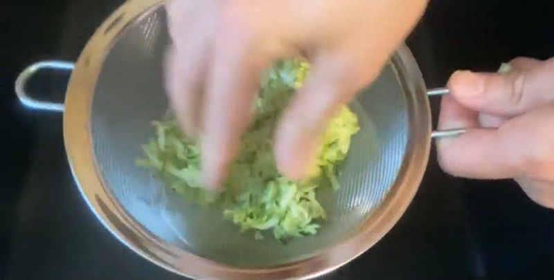 Spălați, curățați şi radeți pe răzătoare dovleceii; se sărează şi se lasă 15 minute să se