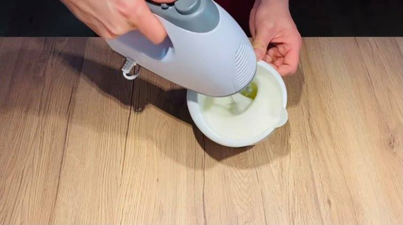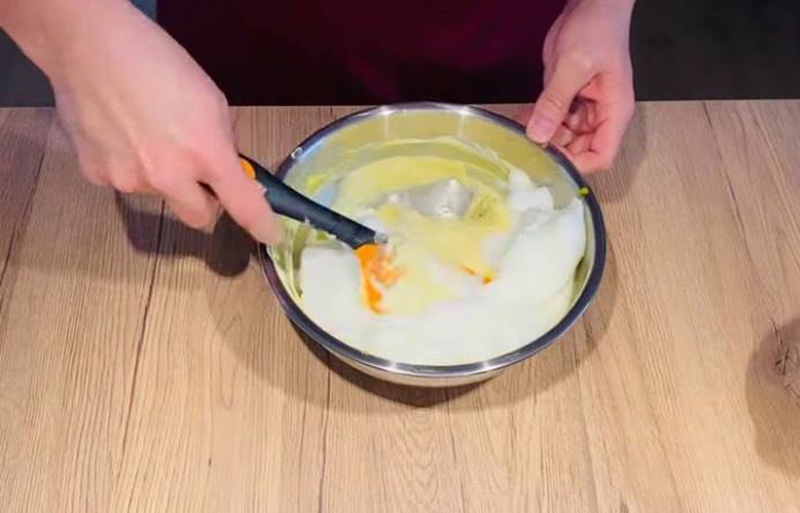 După care se adaugă albușurile și se amestecă cu o spatulă de silicon, de jos în sus, până se încorporează albușurile cu urda! Atenție, nu se amestecă foarte mult, așa obțineți o umplutură de clătite foarte aerată!