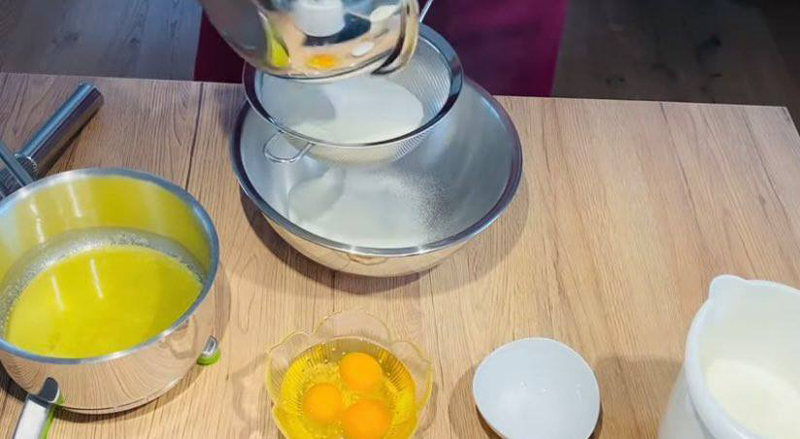 Într-un vas se cerne făina printr-o sită, după care se adaugă laptele, ouăle, sarea și zahărul; după ce s-a amestecat bine, se adaugă untul topit și se mai amestecă puțin, până când untul s-a încorporat în aluatul de clătite (pentru că am pus unt lichid în compoziție, nu mai avem nevoie de ulei să se coacă clătitele); bine, acum contează foarte mult și tigaia pe care o folosiți! De recomandat este una antiaderentă!