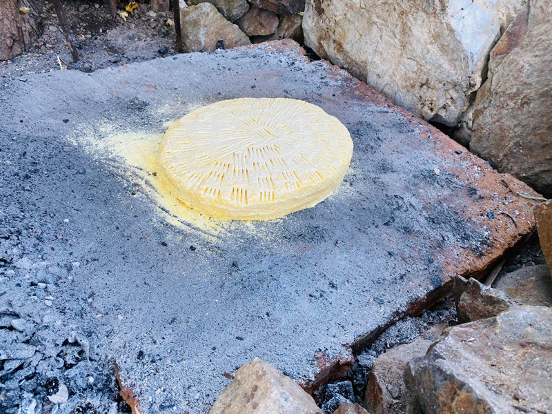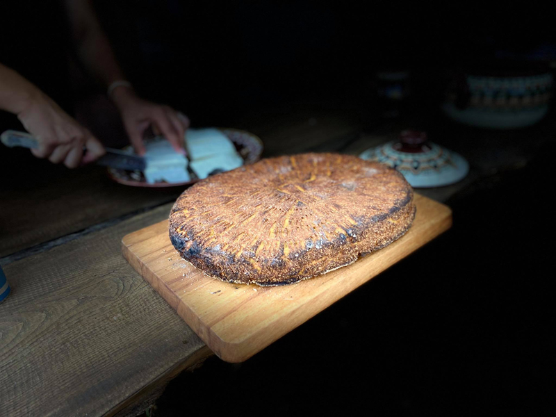 Turta se pune pe un cârpător şi se pune pe vatră. Dacă doriţi, se poate pune sub turtă nişte frunză de viță de vie.