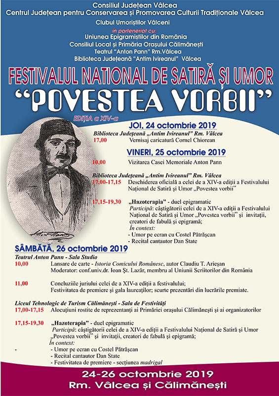 Sâmbătă, 26 octombrie 2019, la Teatrul „Anton Pann” – Sala Studio, începând cu ora 10.00 a avut loc o lansare de carte „Istoria Comicului Românesc”, autor Claudiu T. Arieșan. Moderatorul evenimentului a fost conf. univ. dr. Ioan Șt. Lazăr, membru al Uniunii Scriitorilor din România. În continuare s-au prezentat concluziile juriului celei de-a XIV-a ediții, a festivalului și a urmat festivitatea de premiere și gala laureaților, la epigramă și fabulă.