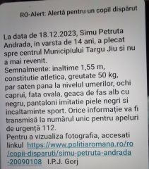 Potrivit IPJ Gorj, Simu Petruța Andrada a plecat ieri, 18 decembrie, spre centrul municipiului Târgu Jiu și nu a mai revenit. Cetățenii care au informații despre adolescentă sunt îndemnați să sune la 112.