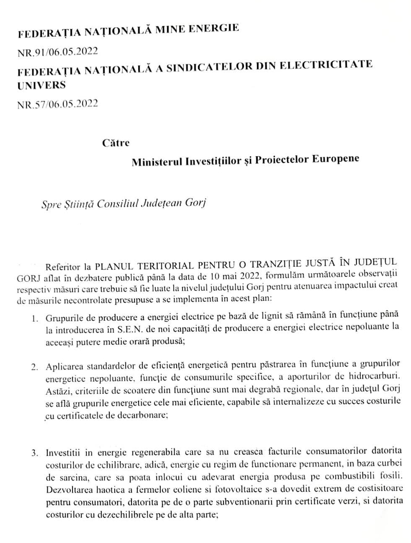 Federația Națională Mine Energie și Federația Univers au formulat observații, la finele săptămânii trecute, cu privire la Planul teritorial pentru tranziție justă, aflat în dezbatere publică, pe care le-au trimis Consiliului Județean Gorj și Ministerului Investițiilor și Proiectelor Europene. Sindicaliștii cer să nu se renunțe la cărbune, până când nu vor exista alte capacități de producere a energiei nepoluante capabile să-l înlocuiască în sistemul energetic național.