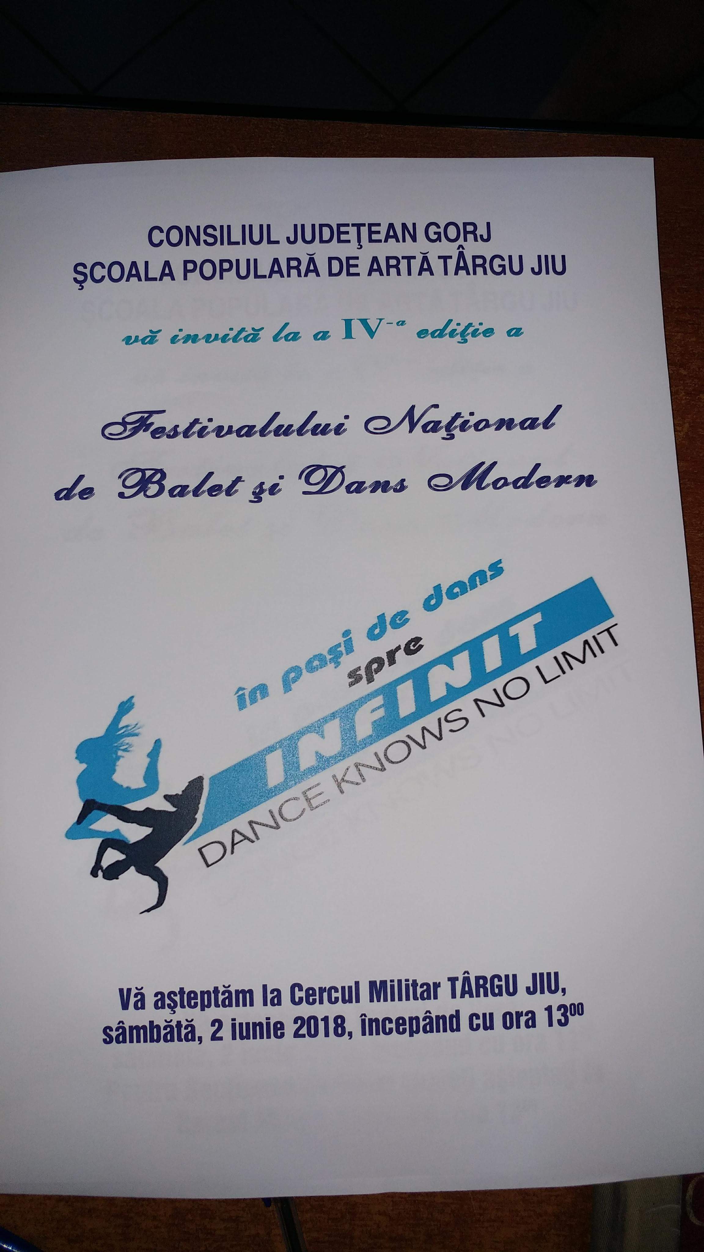 La Centru Militar din Târgu-Jiu, sâmbătă, cu începere de la ora 13.00, va avea loc a IV-a ediție a Festivalului Național de Balet și Dans Modern ,,În pași de dans spre Infinit”. Pe scenă vor urca 35 de copii, care vor concura în această competiție la care sunt invitații și elevi ai Odette Ballet School și ai unei școli de balet din Craiova.