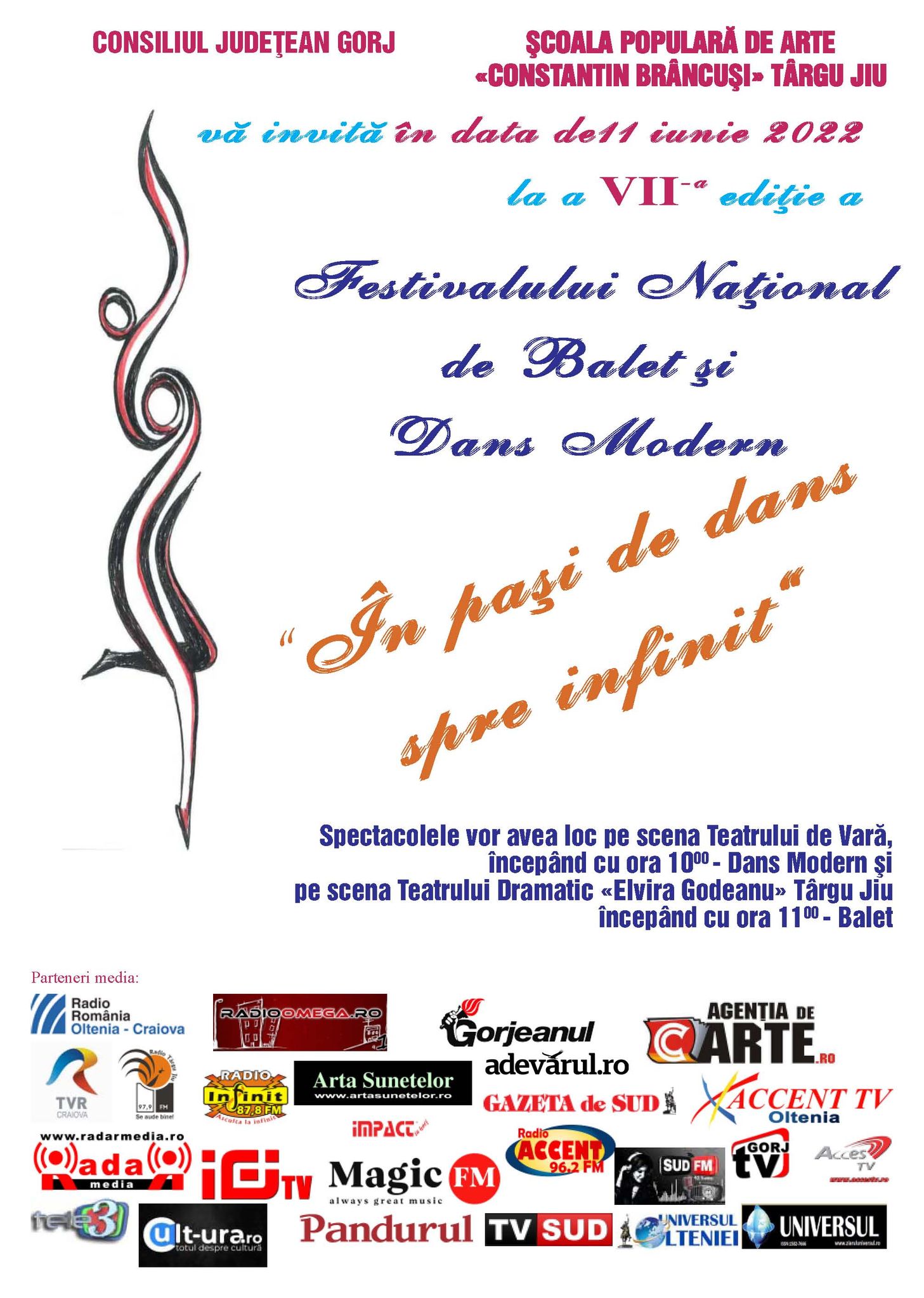 Târgujienii se vor bucura sâmbătă, 11 iunie, de frenezia dansului modern, dar și de grația și perfecțiunea baletului în cadrul celei de a VII-a ediții a Festivalului Național de Balet și Dans Modern „În pași de dans spre INFINIT”. Această ediție se adresează cursanților disciplinelor de balet și dans modern din școlile populare de artă, cluburi ale copiilor și alte unități școlare din țară.