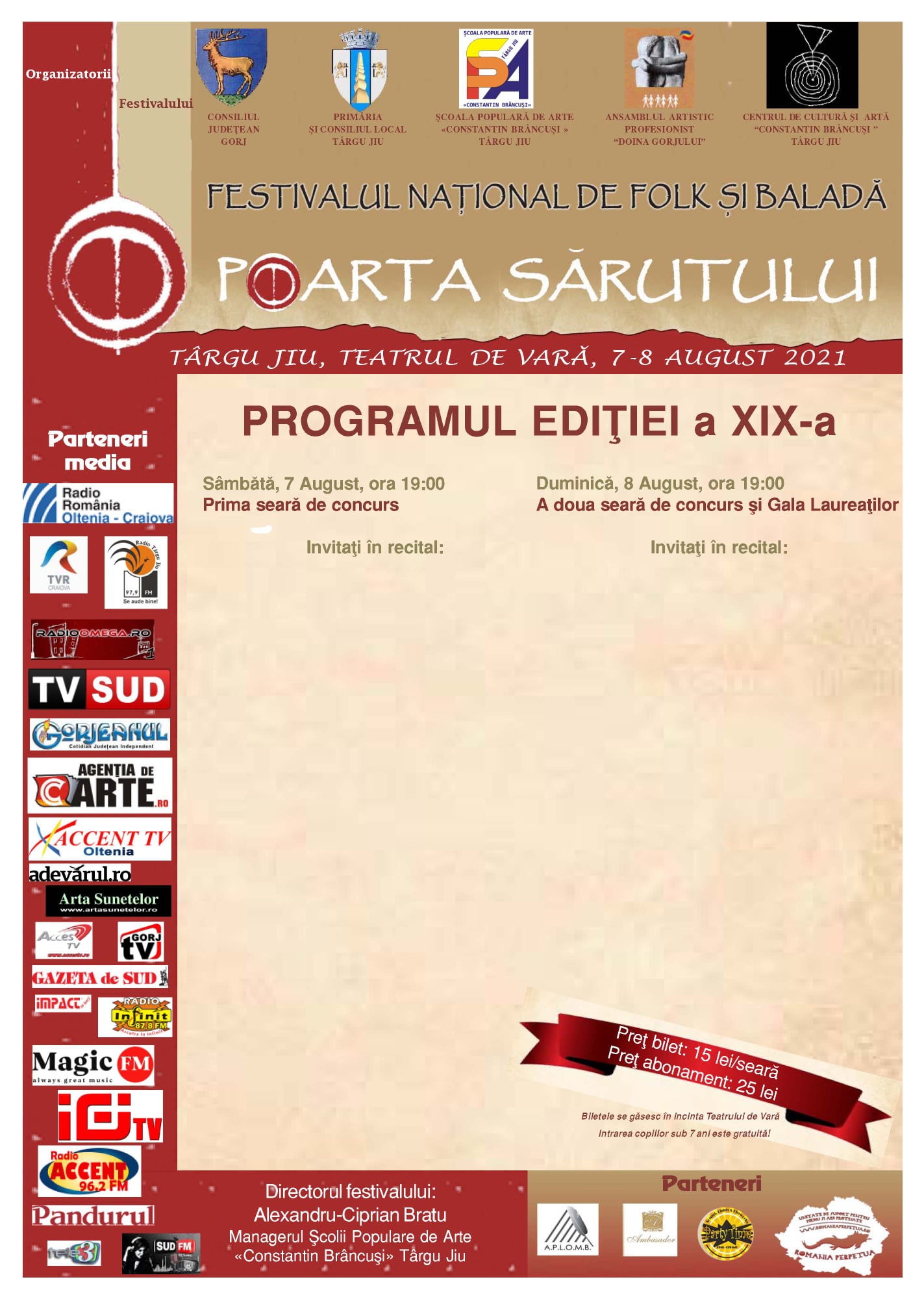 Luna viitoare, la Târgu-Jiu, se va desfășura o nouă ediție a Festivalului Național de Folk și Baladă ”Poarta Sărutului”. ”Pentru iubitorii de muzică și poezie, Școala Populară de Arte ”Constantin Brâncuși” Târgu Jiu anunță cea de-a XIX-a ediție a Festivalului Național de Folk și Baladă ”Poarta Sărutului”. În 2021, vă dăm întâlnire pe 7 și 8 august, în Târgu Jiu, la Teatrul de Vară ”Nelu Dumitru”. Revenim cu mai multe detalii în curând!”, au anunțat organizatorii.