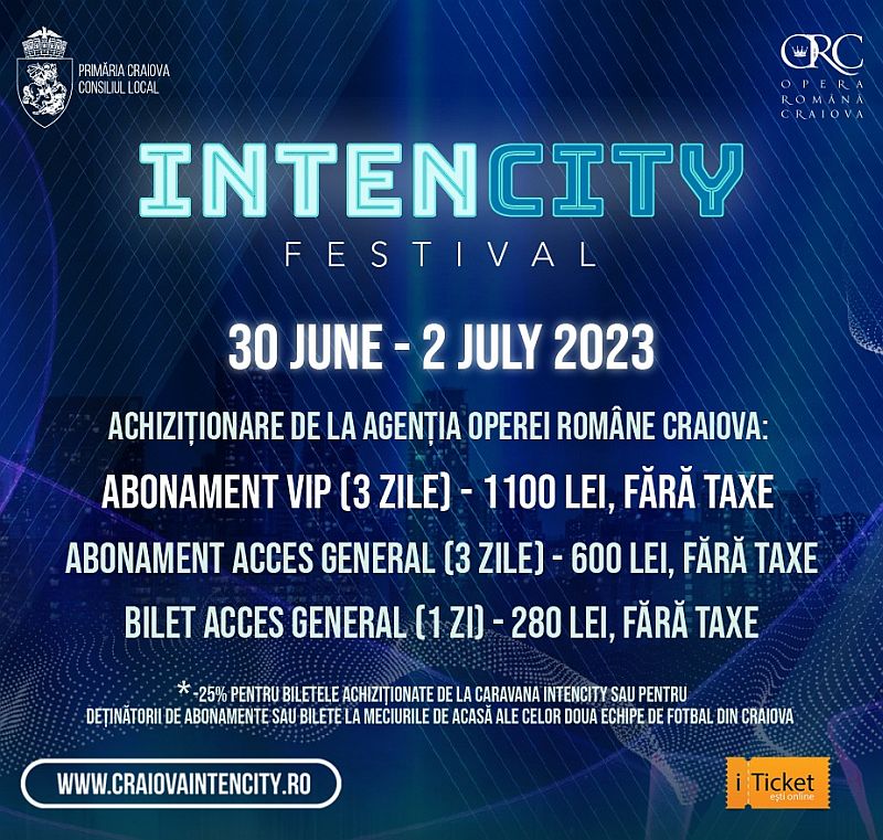 Suporterii celor două echipe de fotbal din Craiova, deținători de abonamente sau bilete la meciurile de acasă, au parte de reducere de 25% la cumpărarea biletului/abonamentului la Festivalul IntenCity de la Agenția Operei Române Craiova de la Sala Polivalentă.